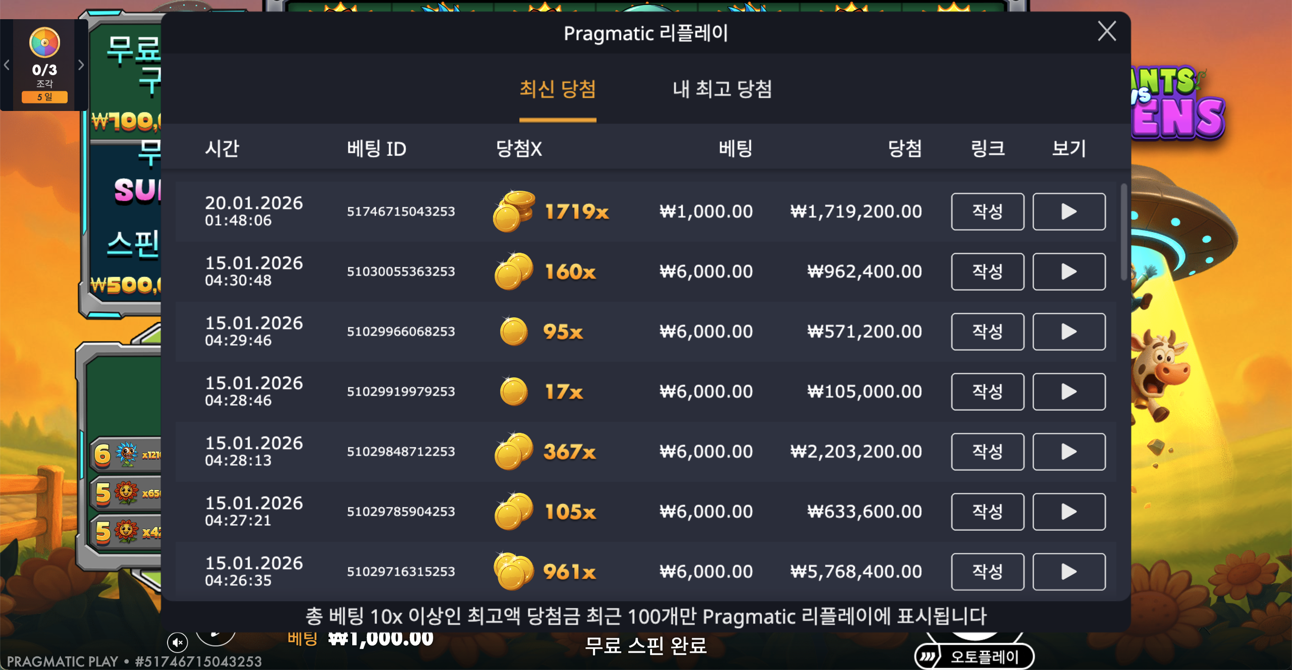 잭팟이 터진 순간의 스크린샷 및 링크를 첨부해주세요.