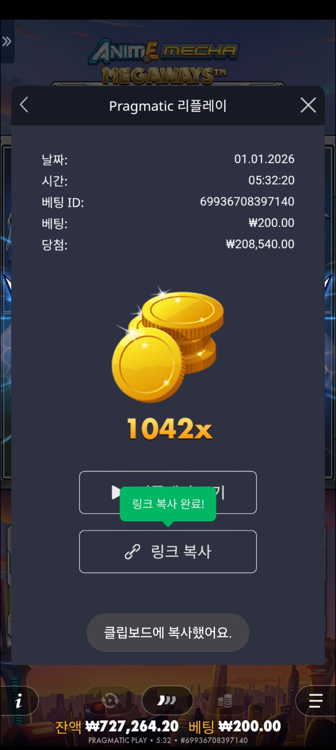 잭팟이 터진 순간의 스크린샷 및 링크를 첨부해주세요.
