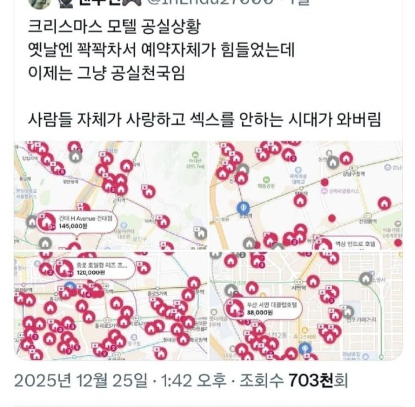 이번 크리스마스 모텔 공실률 근황 ㄷㄷ 작성자 정보 하늘채쪽지보내기 자기소개 이름으로 검색쪽지보내기 자기소개 이름으로 검색 작성 작성일 2025.12.27 05:29 컨텐츠 정보 11 조회 2 댓글 0 추천 목록 본문 이번 크리스마스 모텔 공실률 근황 ㄷㄷ 0 추천 관련자료 댓글 2 하늘채님의 댓글 하늘채쪽지보내기 자기소개 이름으로 검색쪽지보내기 자기소개 이름으로 검색 작성일 05:29 ㅋㅋㅋ ㅋㅋㅋ ㅋㅋㅋ ㅋㅋㅋ 행복hams님의 댓글 행복hams쪽지보내기 자기소개 이름으로 검색쪽지보내기 자기소개 이름으로 검색 작성일 10:00 좋아요 잘 보고 갑니다 10 럭키포인트 당첨! 좋아요 잘 보고 갑니다 로그인한 회원만 댓글 등록이 가능합니다. 목록